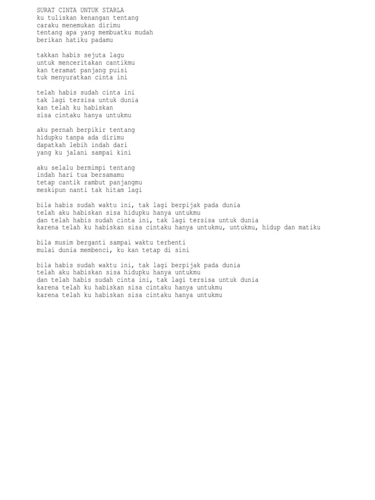 Aqsa cintaku hanya untukmu dan telah habis musnah hati ini tika kau diseksa dengan dunia tangis telah ku habiskan aqsa cintaku, hanya untukmu bridge: Untukmu jiwa dan darahku bila musim berganti sampai waktu terhenti walau dunia membenci kau tetap milik kami last chorus telah habis musnah hati ini tika kau diseksa dengan dunia Surat cinta untuk aqsa mengisahkan tentang luahan perasaan tentang betapa cintanya. Contoh surat cinta untuk senior. Ulang semula oleh irhamkamal dan taufik. Kan ku bimbing jalanmu, kan ku temanimu, sepanjang apa pun kau cari������ korus:.