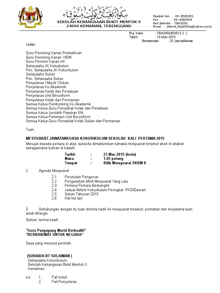 Agenda mesyuarat adalah seperti berikut: Program jqaf dan tasmik dimasukkan dalam jadual waktu. Kelab kembara dan rekreasi, ruj. (nama sekolah ) , · berkhidmat untuk negara · saya yang menurut perintah,. Agenda mesyuarat adalah seperti berikut; Baca versi flipbook dari surat panggilan mesyuarat 2020 kali kedua.