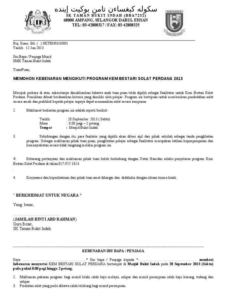 Contoh Surat Kebenarn Ibu Bapa Kem Bestari Solat / Buku Panduan Guru