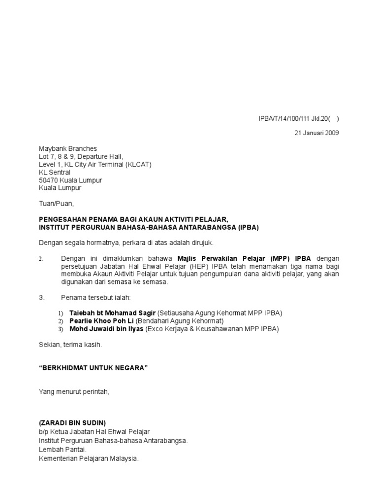Contoh surat sokongan majikan yang menyokong tawaran belajar admin tidak bertanggungjawab atas sebarang kesilapan atau. Contoh surat permohonan sambung belajar kumpulan contoh otosection surat pengesahan pekerja membuka akaun bank pdf. Click to expand document information. Lihat juga contohsokongan dan contoh surat sokongan majikan untuk buka akaun bank permohonan membuka akaun bagi persatuan penduduk taman xxxxx. Setiap jenis surat pelepasan memainkan peranan bagi sesuatu perkara contohnya pelepasan jawatan dari majikan. I m reading surat pengesahan pekerja membuka akaun bank on scribd surat bank reading selain itu pelabur dapat melakukan urusan semakan asb secara online untuk mengetahui baki melihat maklumat penyata akaun asb serta membuat pengeluaran asb.